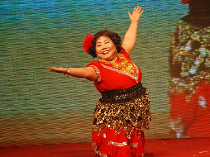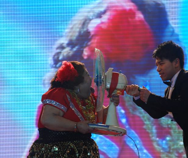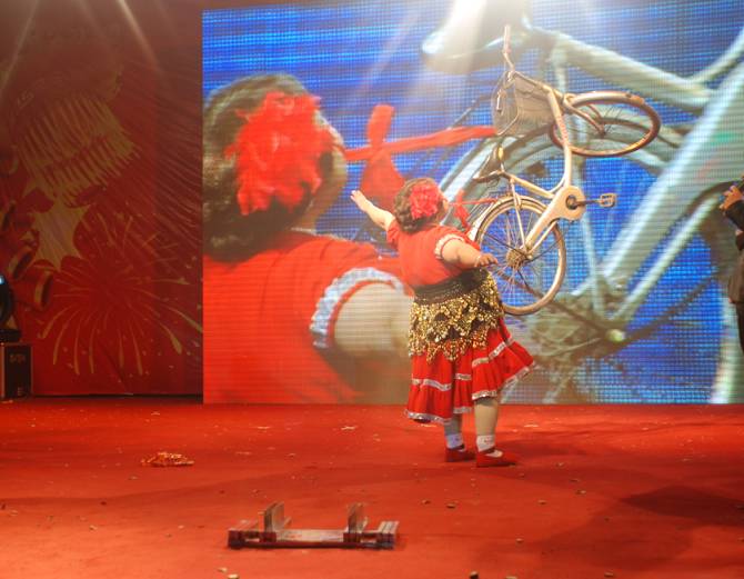 中国达人、民间绝技传承者---李红沁现场展示舌定风扇,口转自行车,赤脚负重踩刀。